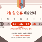 - 공지 설 연휴 주문 및 배송 안내 📢 설 연휴 주문 및 배송 안내2/14(토), 2/18(수), 2/19(목) 배송건📦➡️2/13(금) 12시(정오)까지 🌟주문 및 입금 완료🌟 부탁드립니다. ⚠️제주권은 배송불가 ...