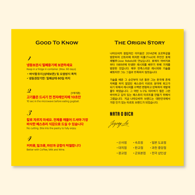🔔[맛있게 먹는 법] 리플렛 리뉴얼 안내🤤나따오비까 맛있게 먹는 법 리플렛이 리뉴얼 되었습니다.와인 컬러를 포인트로 넣어 쇼핑백에 넣었을때 더 잘 보이도록 디자인되었으며, 타르트 종류 및 브랜드 스토리도 추가 되었습니다.✅적용시점은 기존 리플렛 재고에 따라 바뀔수 있으며 1~2월 중 자동 변경 될 예정입니다.